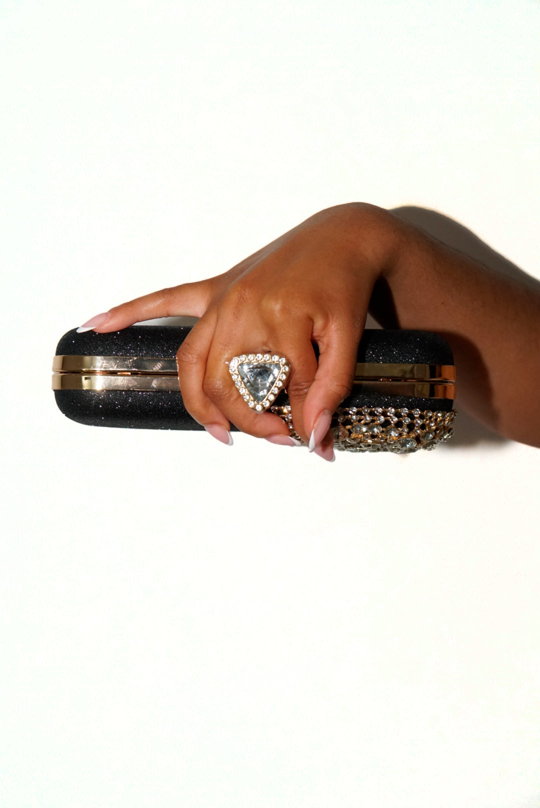 Este elegante bolso de embrague está adornado con brillantes que capturan la luz de manera deslumbrante. Además cuenta con una delicada cadena que te permitirá llevarlo con elegancia de la mano o colgado del hombro.